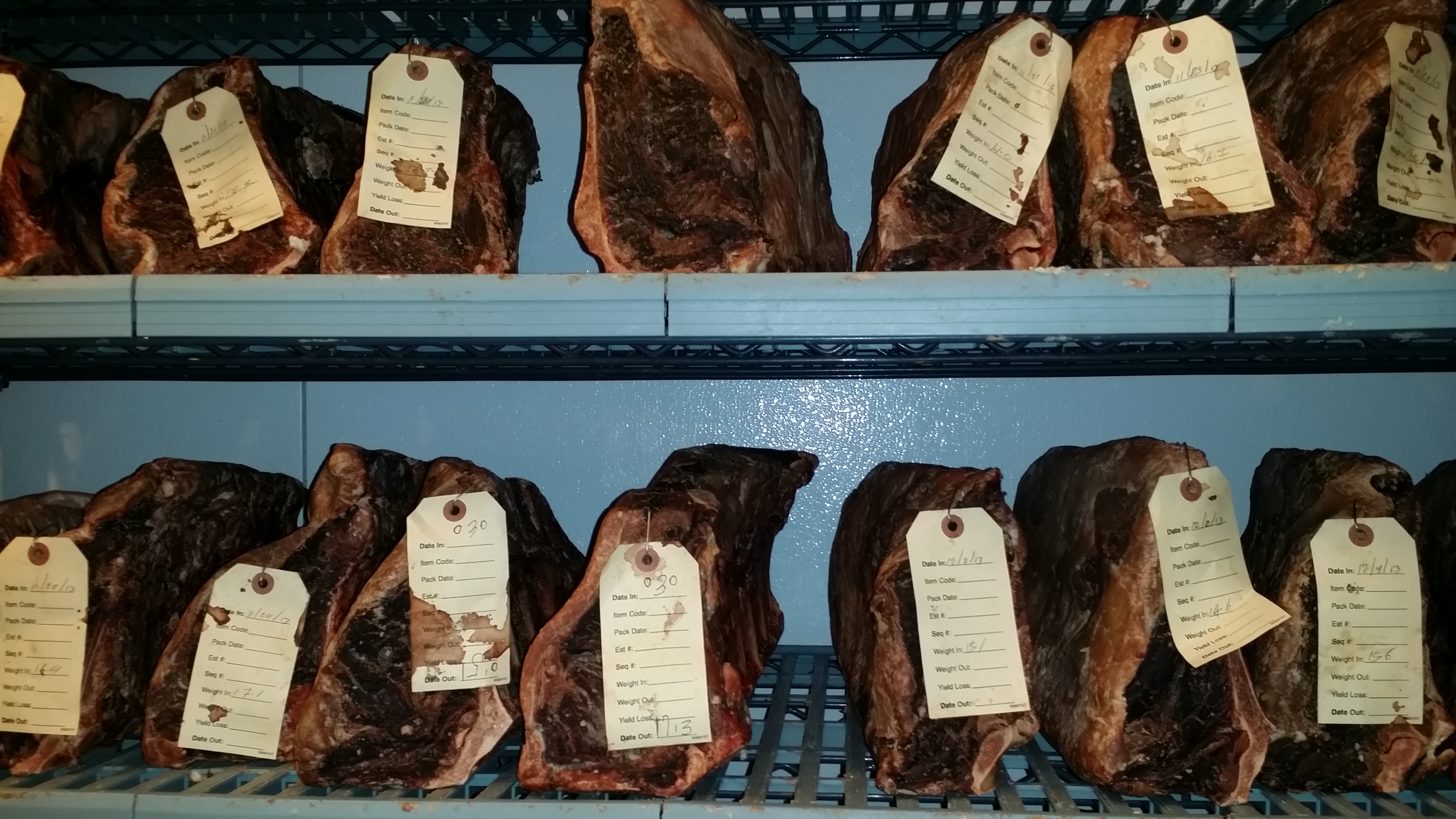 20140104_223218I told Jamie how amazed I was to have such an excellent meal every time I went there, and that I was fascinated by  the whole dry aging process.  About 2 weeks ago, Sherry showed me a video that she had recorded about Barefoot Contessa while she was on vacation to Napa Valley, and visited Tyler Florence, who shared with her his Porterhouse Steak recipe (dry aged of course) cooked in a 1200 degrees broiler and bathed in a bath of clarified butter, sage, thyme and garlic mixture. I shared what I saw that day with Jamie, and he proceeds to tell me, oh! we have a 1800 degrees broiler here, and a whole room with dry aged meat, would you like to see how we do it??? Helloooooooooooo? Have we met?? Are blueberries blue??? Do you tell Noah about a flood (I just learned that expression from my husband! been wanting to use it for a while 🙂 ).