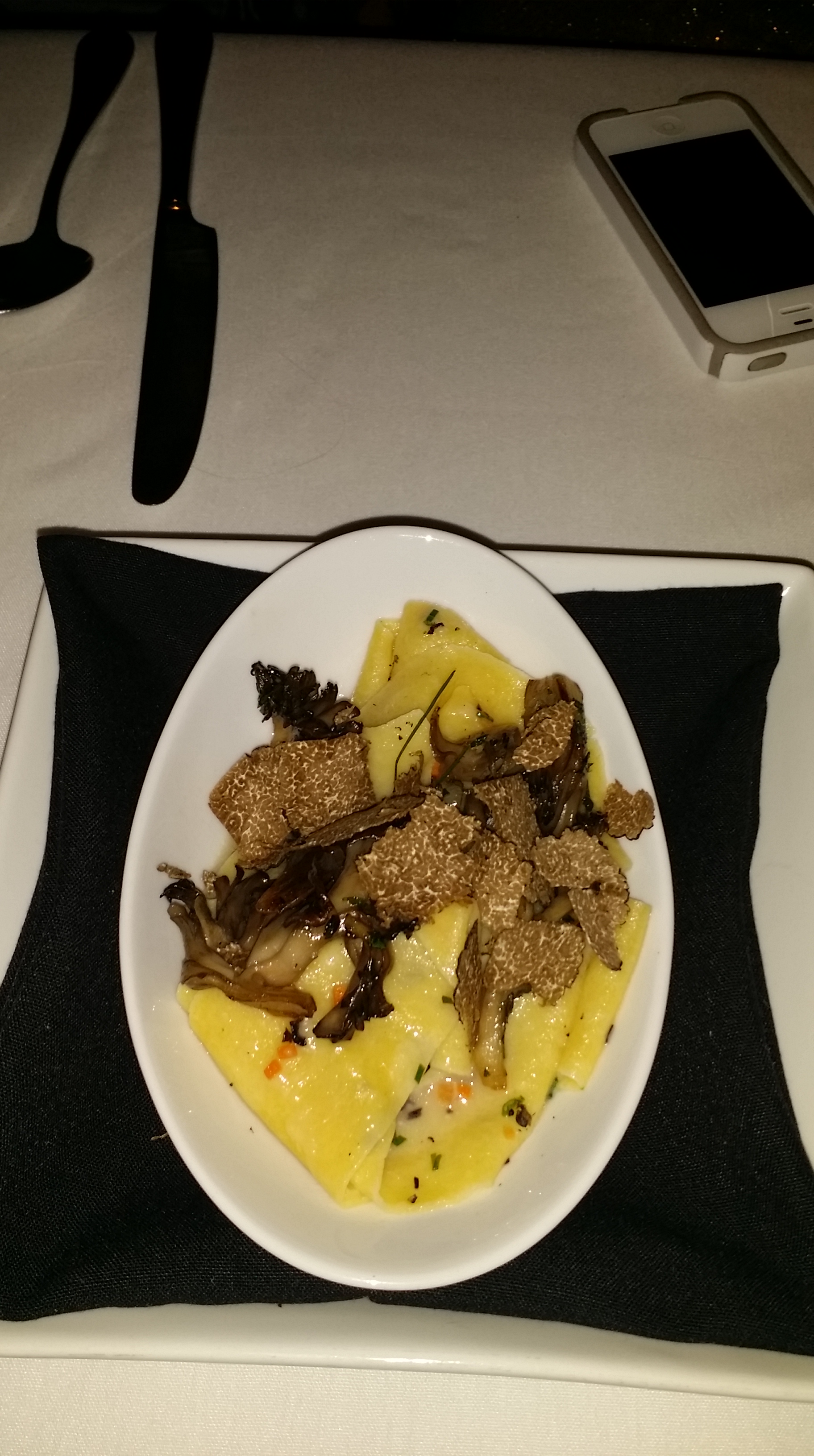 Another selection off of the vegetarian menu was chosen by Melissa. It was a raviolo of spinach with a bantam egg yolk and white alba truffles. Decadent!