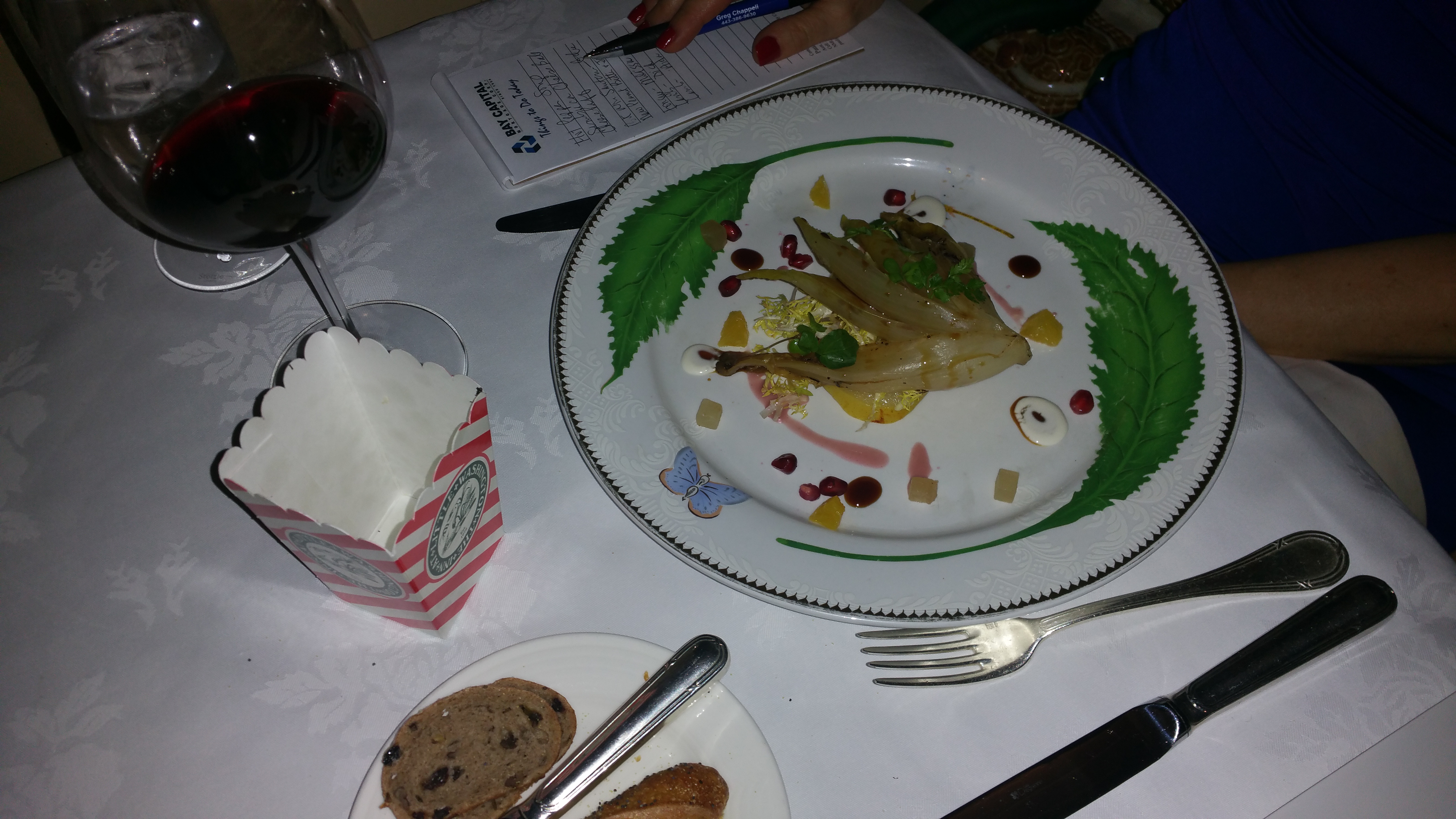 After sitting down, I was tasked with choosing a bottle of wine, the pressure was on! Going through the 87 pages of outrageously expensive and most fabulous wines I have seen in a long time, I settled for a bottle of Chateaux the Fieuzal 2004 Premiere Cru Classe 2004 for the itty bitty price of $105 a bottle (trust me, for that place, that is a very decent bottle of wine, average being in the $300’s, highest being $10,000!!!!).