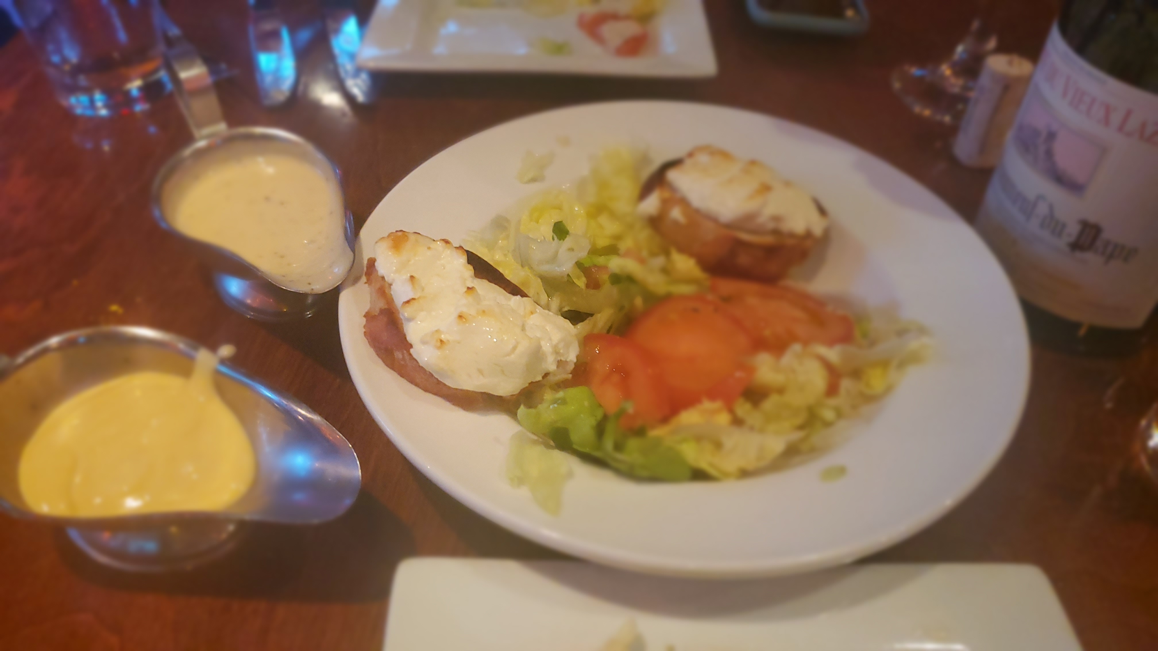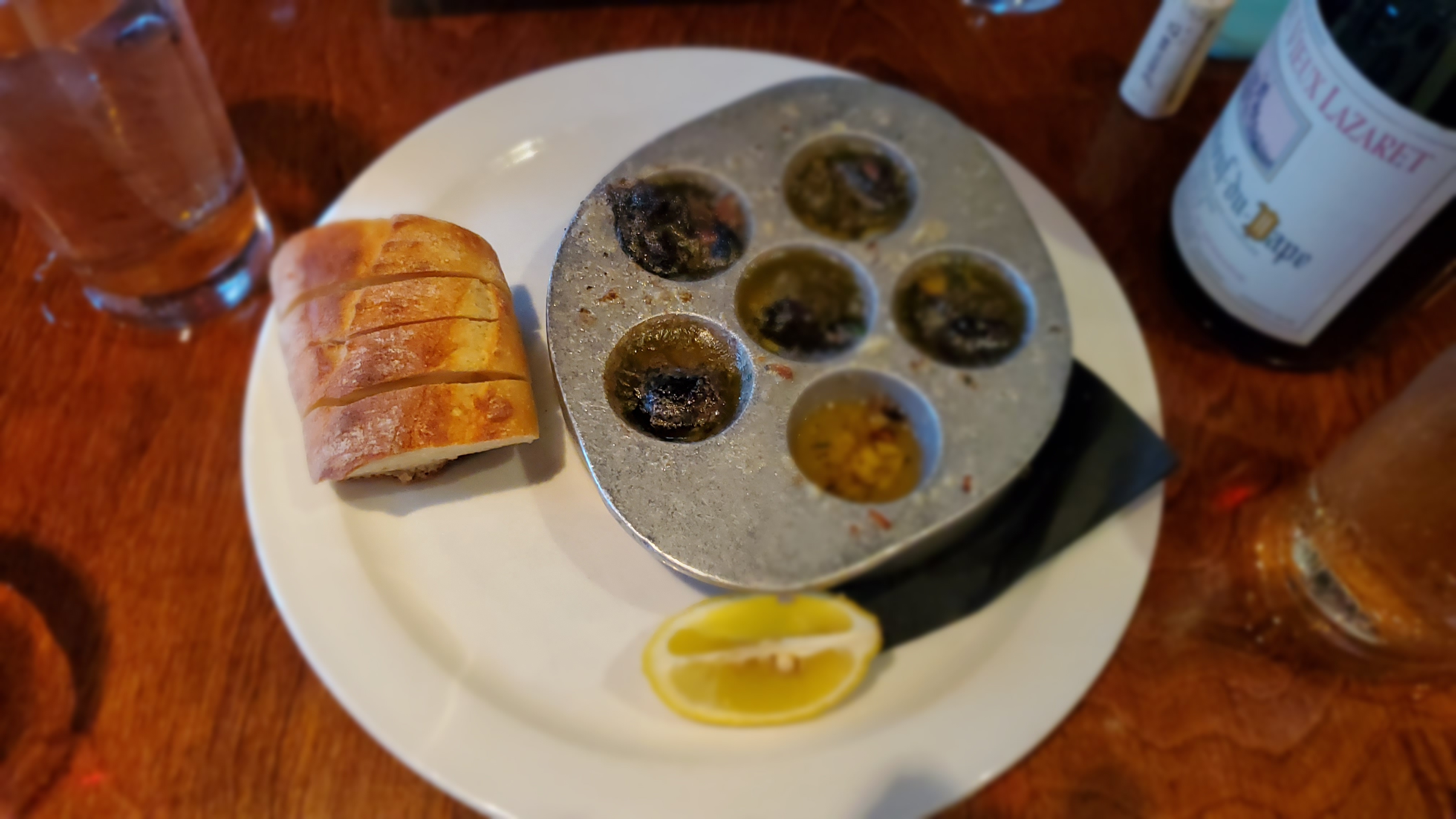 We told Elise how thankful we were for being able to be there, and how badly we felt about leaving Costera the way we did. We ordered a bottle of Domaine Du Vieux Lazaret Chateauneuf Du Pape 2018, escargots and a Salade Chevre Chaud (Green salad with tomato, vinaigrette du jour and goat cheese crouton).
