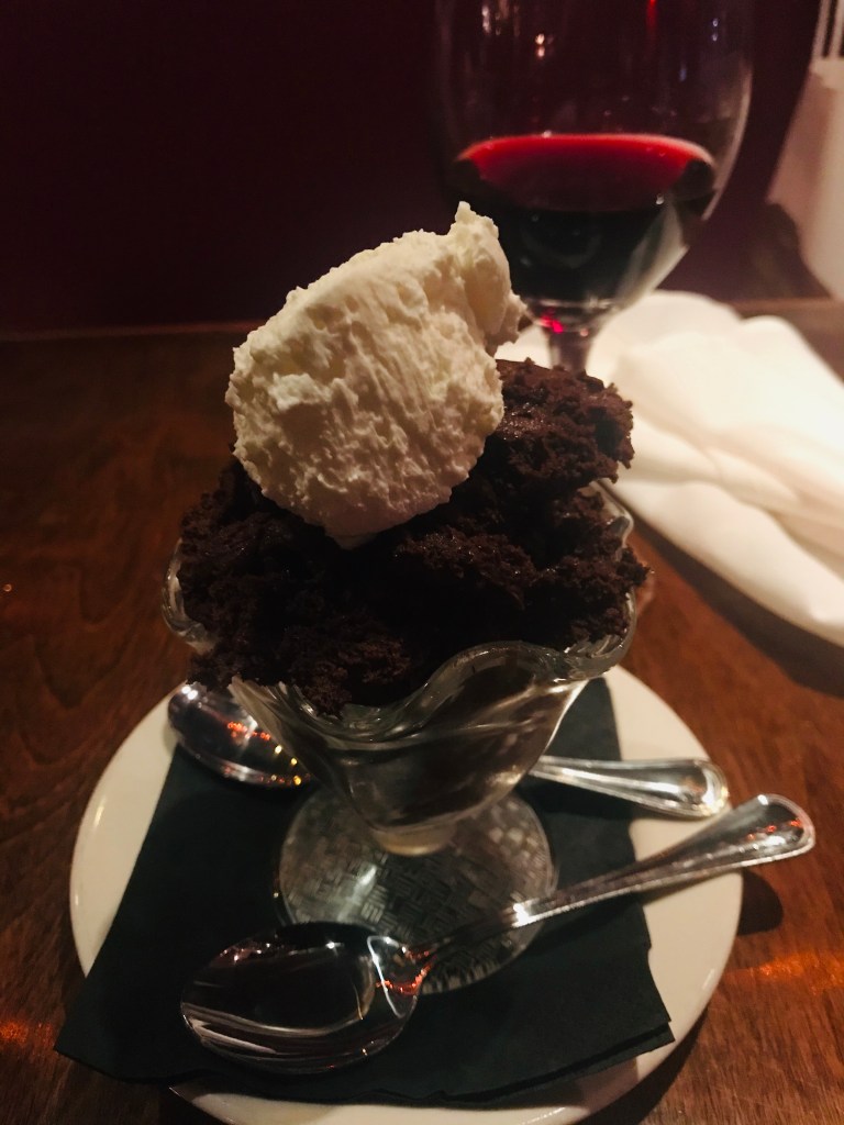 Like Sherry always says with her Southern Accent: “OH MY WORD…”. Absolutely decadent, texture was a hybrid between a Pot De Crème and a mousse, topped with the delicious red wine we were drinking. We simply died in ecstasy.