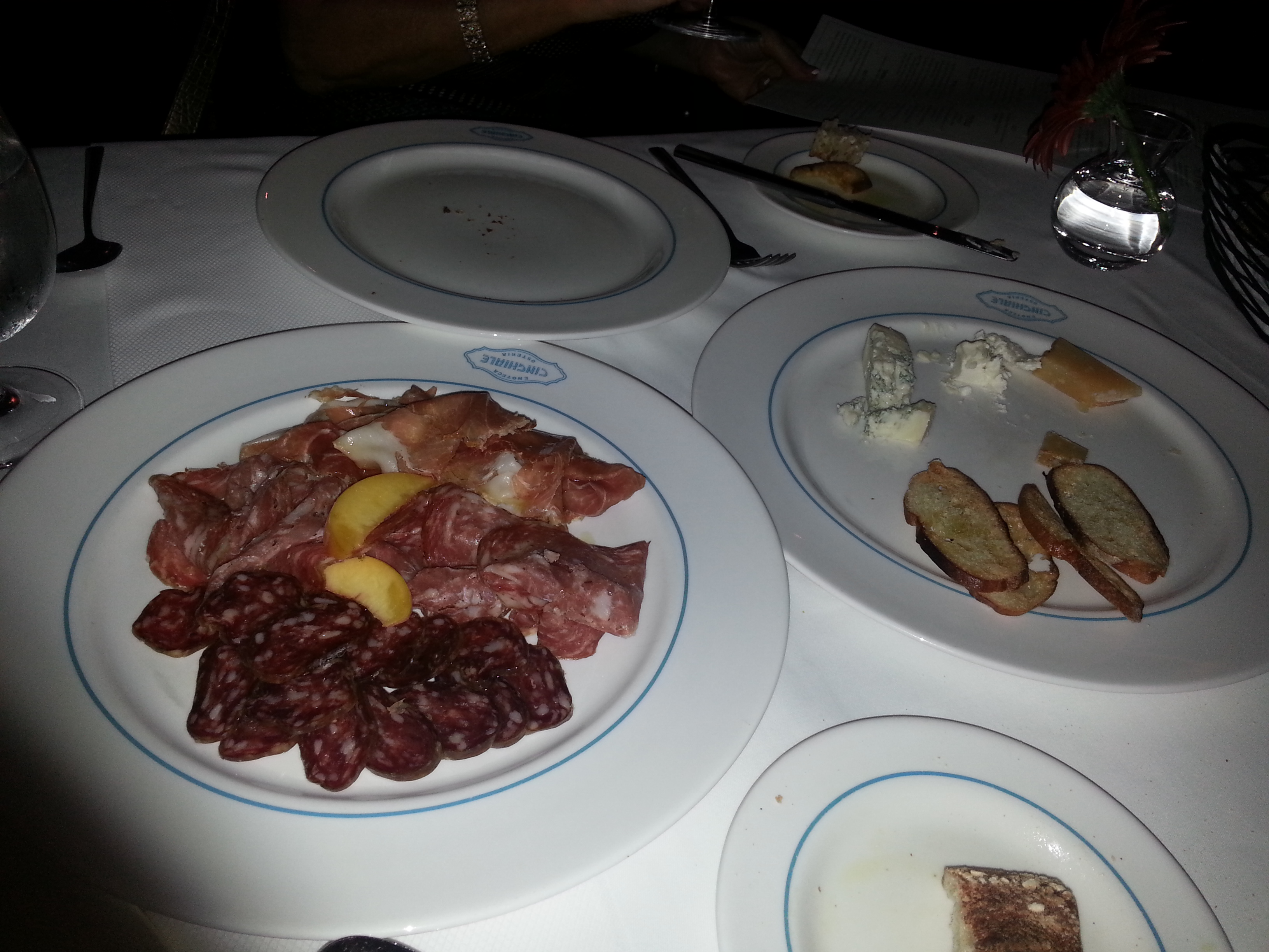 Having been fortunate enough to visit Italy twice in my life, I have to say that Cinghiale really feels like a fine hotel/restaurant in Rome. Let’s talk about food, shall we? Since all of the Hungry Women love cheese and wine, we decided to go with a selection of 3 cheeses. First, the la tur, a tangy blend of sheep, cow and goat’s milk…excellent! Second, we chose the canestrato from Campania…a firm sheep’s mild cheese with hints of hay and hazelnuts. Jessica paired that with some fresh peaches…loved that! The third cheese was a creamy Gorgonzola gran riserva…. My oh my! We chose a Rosso di Montalcino, Il Poggione to accompany the cheese course and also the Chef’s selection of assorted cured meats.