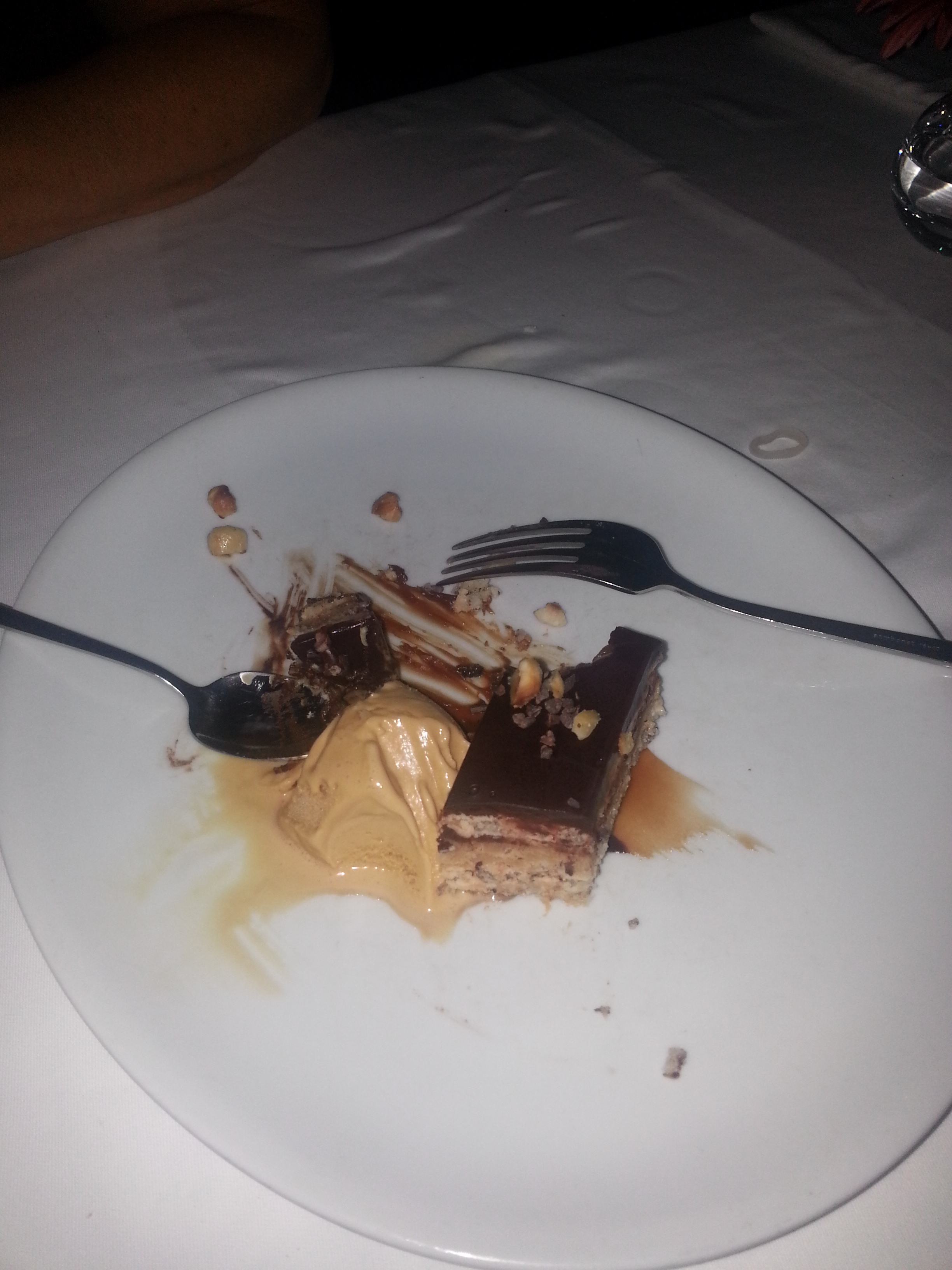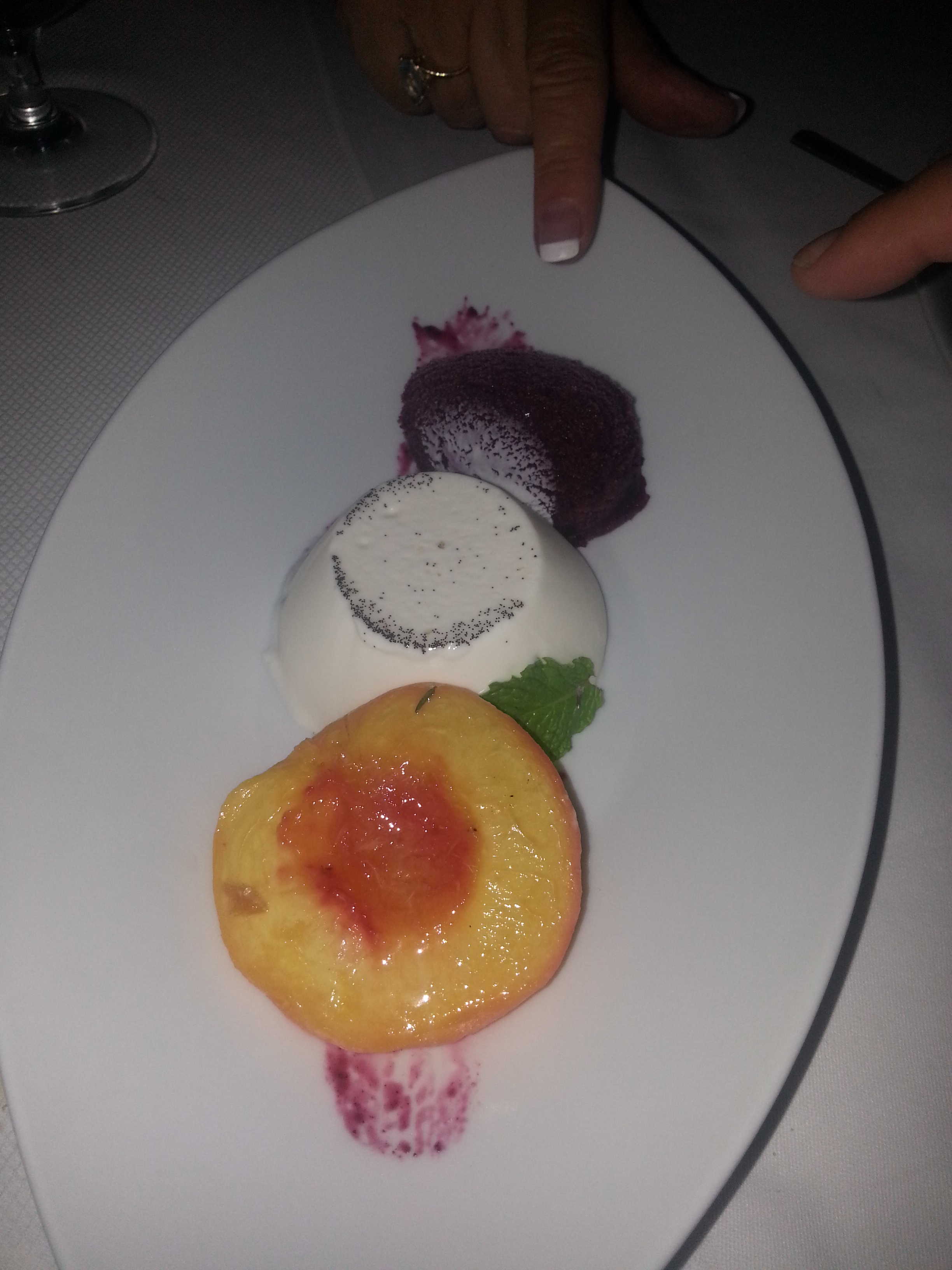 We were satiated but we HAD to try 2 desserts. We chose Gianduja Torta with hazelnuts, chocolate and salted caramel gelato. WE ADORE SALT AND CARAMEL!!! I have to tell you that the vanilla panna cotta with thyme roasted peaches and blueberry sorbetto was so light and creamy, I believe we heard angels singing. I was transported to the Sistine Chapel. This is food nirvana. Espressos followed……