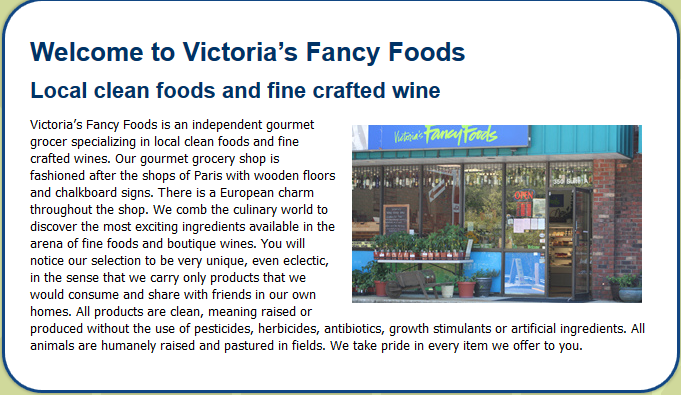 I checked Victoria’s website (http://victoriasfancyfoods.com/) and the front page caught my attention immediately: